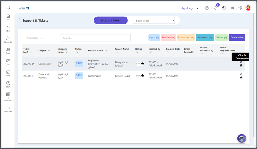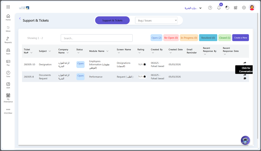 - Find the ticket that you want to change its status in “Open/ InProgress/Re-Open” tab and click on “Click for Conversation”.