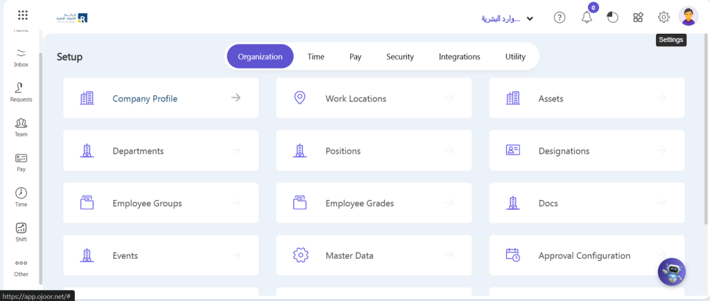 Much of your onboarding in Ojoor is complete when you define your Company Profile, Multi Organization, Locations, Departments, Shifts, Designations, etc. To set up, navigate by clicking the Setup Module and then Company data on the top menu.