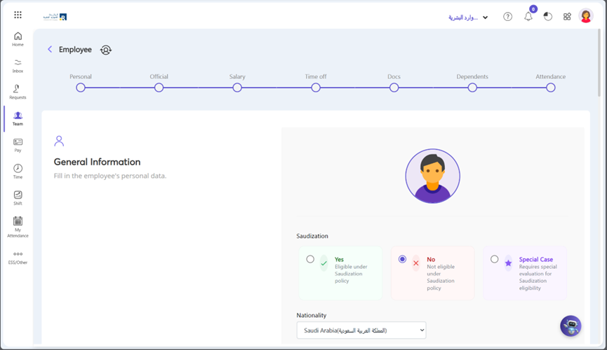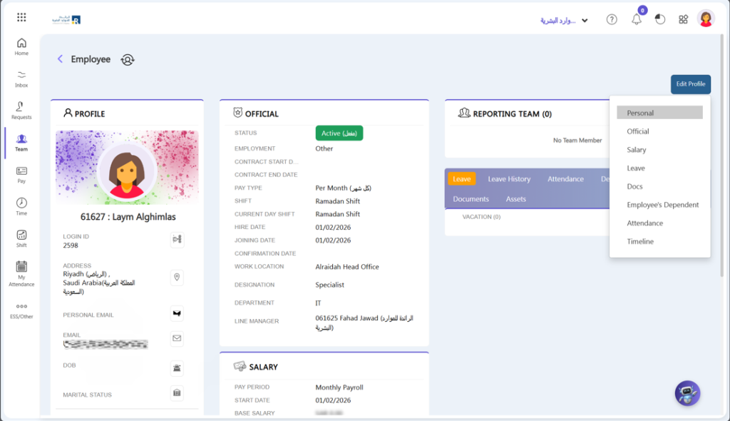 - Employee personal data such as employee profile picture, name, email address, gender, and date of birth can be edited in the personal, employee section.