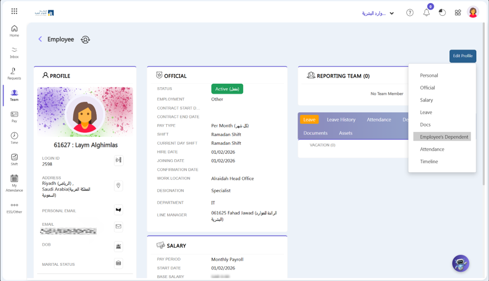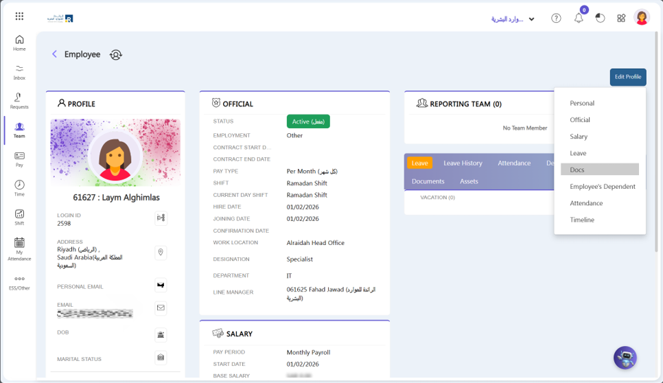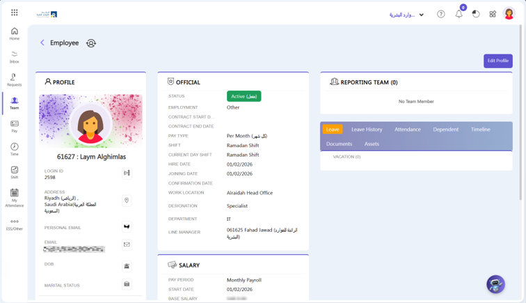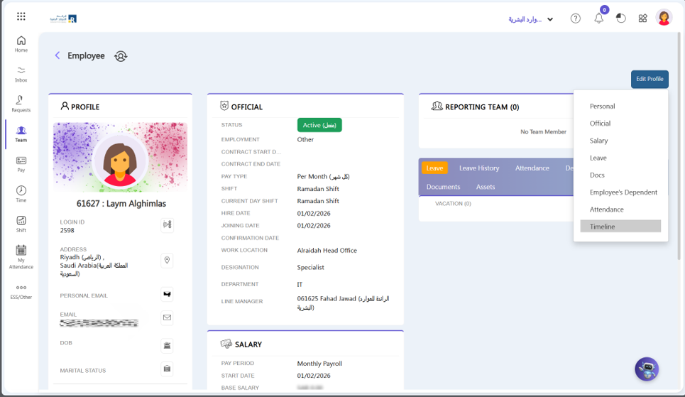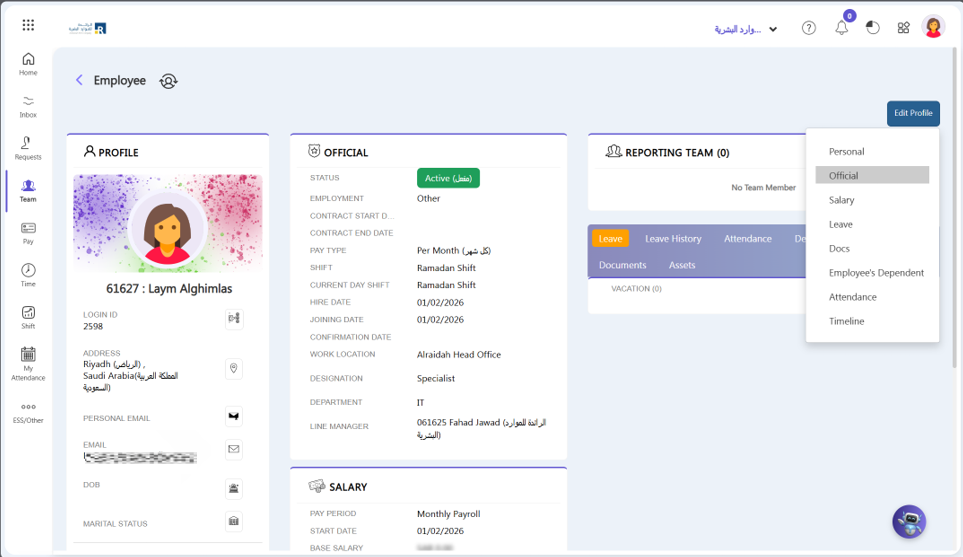 - You can edit an employee’s hiring date, joining date, office location, department, and designations in the official section of their profile.