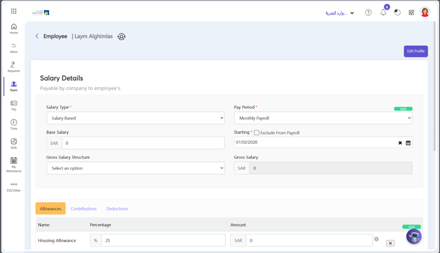 - Here you can edit or select the type of salary, pay period (payroll), basic salary, salary template, allowance, contributions, and deductions.