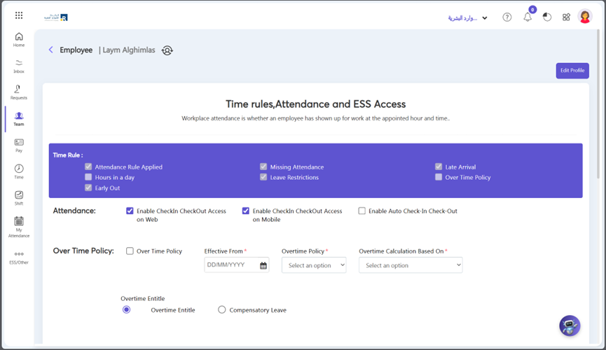 - In the Attendance Section, you can effectively manage employee time rules, attendance, and employee self-service attendance access.